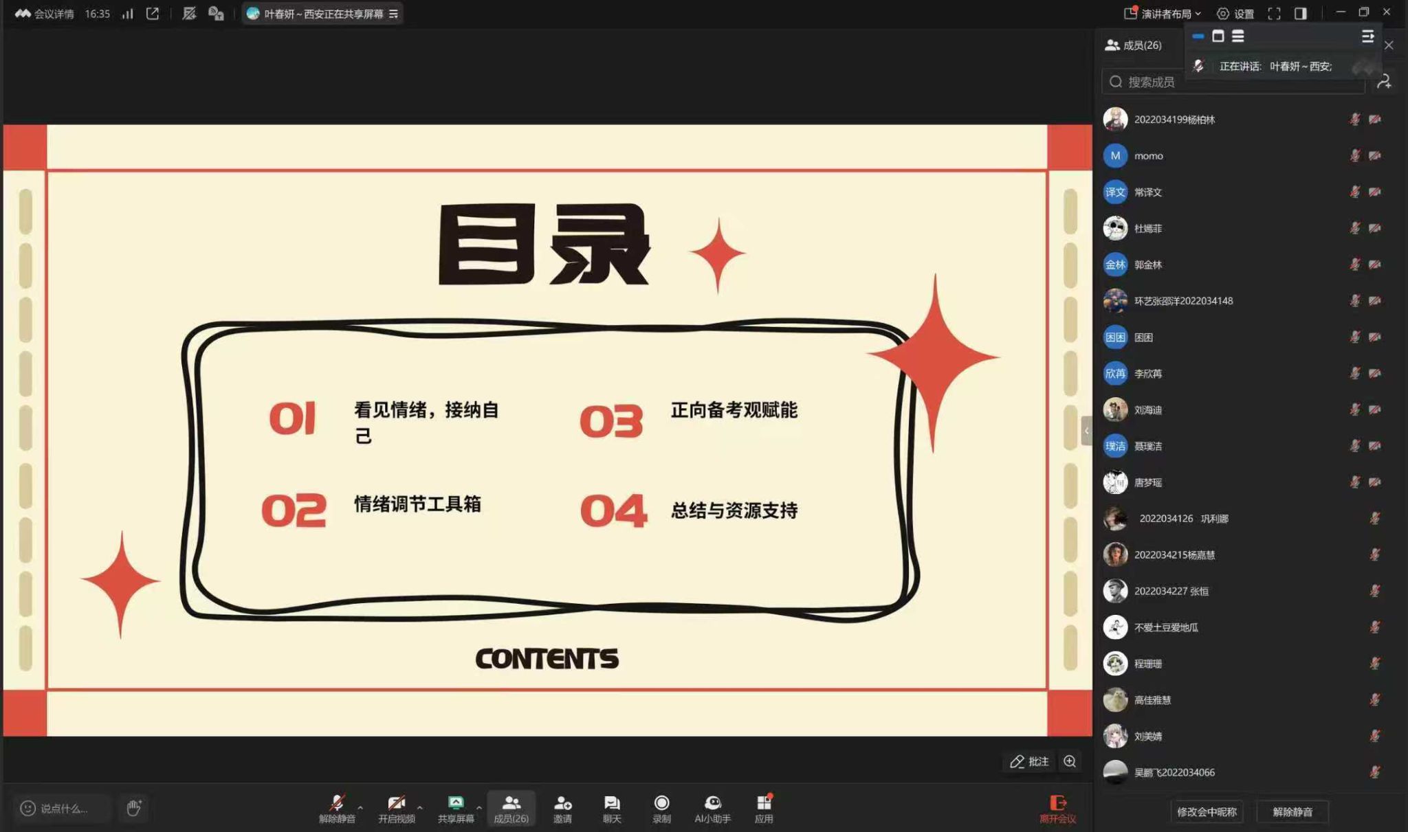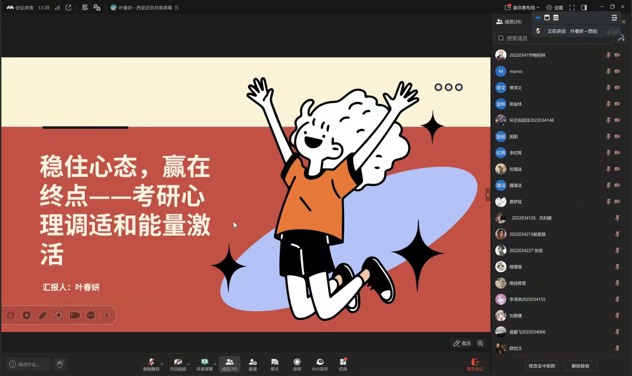 为帮助考研学生缓解压力,以更积极的心态迎接研究生考试。12月2日,加拿大pc28官网 特别邀请国家二级心理咨询师叶春妍老师为2022级研究生考试备考学生召开“稳住心态,赢在终点——考研心理调适和能量激活”线上心理赋能讲座,2022级辅导员陈辛主持。