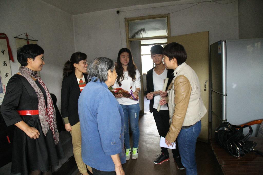 艺术与传媒学院党委书记曹玉玲,学生处副处长,校团委副书记张英,离退休工作处副处长周晔,以及辅导员张晓宾,孙雅茹带领2014级学生爱心志愿者看望我校退休老教职工,并分别与老教职工建立一对一帮扶计划。
